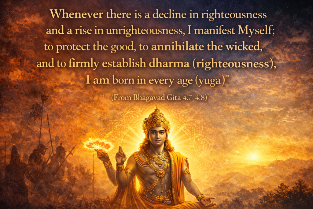 ಯದಾ ಯದಾ ಹಿ ಧರ್ಮಸ್ಯ ಗ್ಲಾನಿರ್ಭವತಿ ಭಾರತ | ಅಭ್ಯುತ್ಥಾನಮಧರ್ಮಸ್ಯ ತದಾತ್ಮಾನಂ ಸೃಜಾಮ್ಯಹಮ್ || ಪರಿತ್ರಾಣಾಯ ಸಾಧೂನಾಂ ವಿನಾಶಾಯ ಚ ದುಷ್ಕೃತಾಂ || ಧರ್ಮಸಂಸ್ಥಾಪನಾರ್ಥಾಯ ಸಂಭವಾಮಿ ಯುಗೇ ಯುಗೇ (ಭಗವದ್ಗೀತೆ 4.7–4.8)